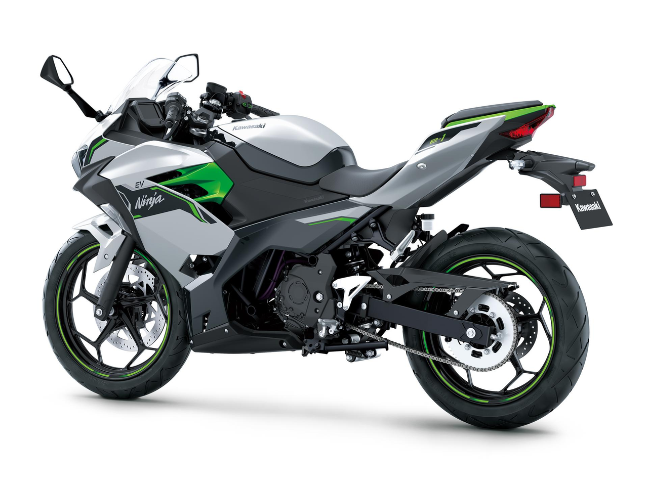 Avec seulement 140 kg, le faible poids du Ninja e-1 contribue à un ensemble facile à manier pour le pilote.