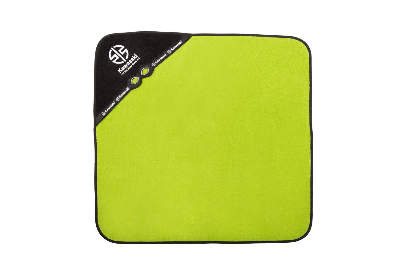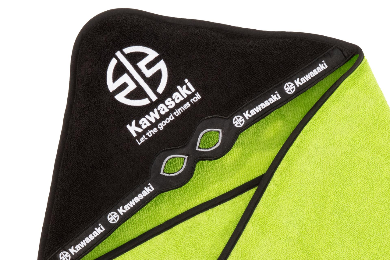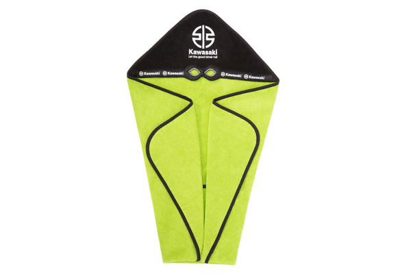 Cette serviette en éponge 100 % coton transforme bébé en bébé-ninja. Serviette à capuche verte avec capuche noire. Dimensions : 75 cm x 75 cm. Bordure noire. Ornée du logo Kawasaki River Mark. 100 % coton.