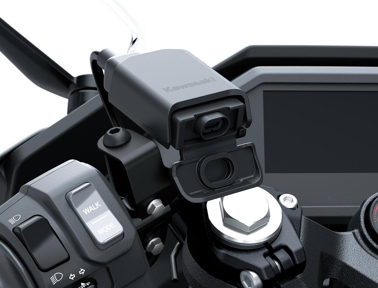 Prise USB-C résistante à l’eau, montée de manière pratique sur le guidon. Amortie contre les vibrations, elle peut être protégée par un capuchon. Courant de sortie maximal total : 3 A. (Pour le fonctionnement, l’installation du kit de relais est requise – disponible séparément.)
