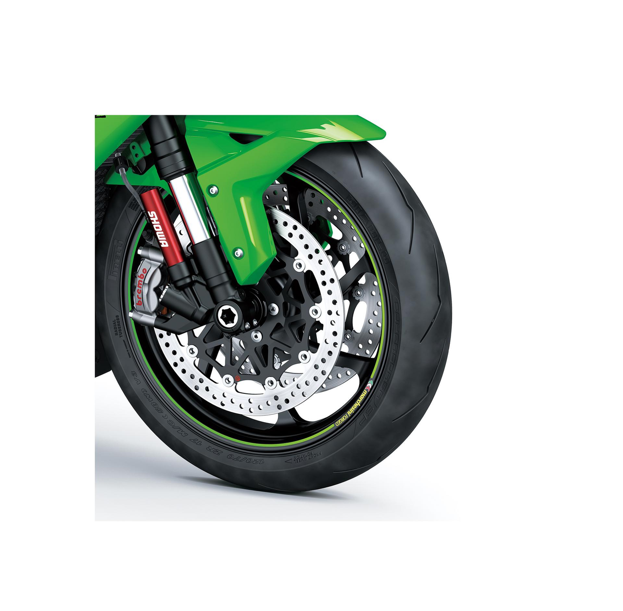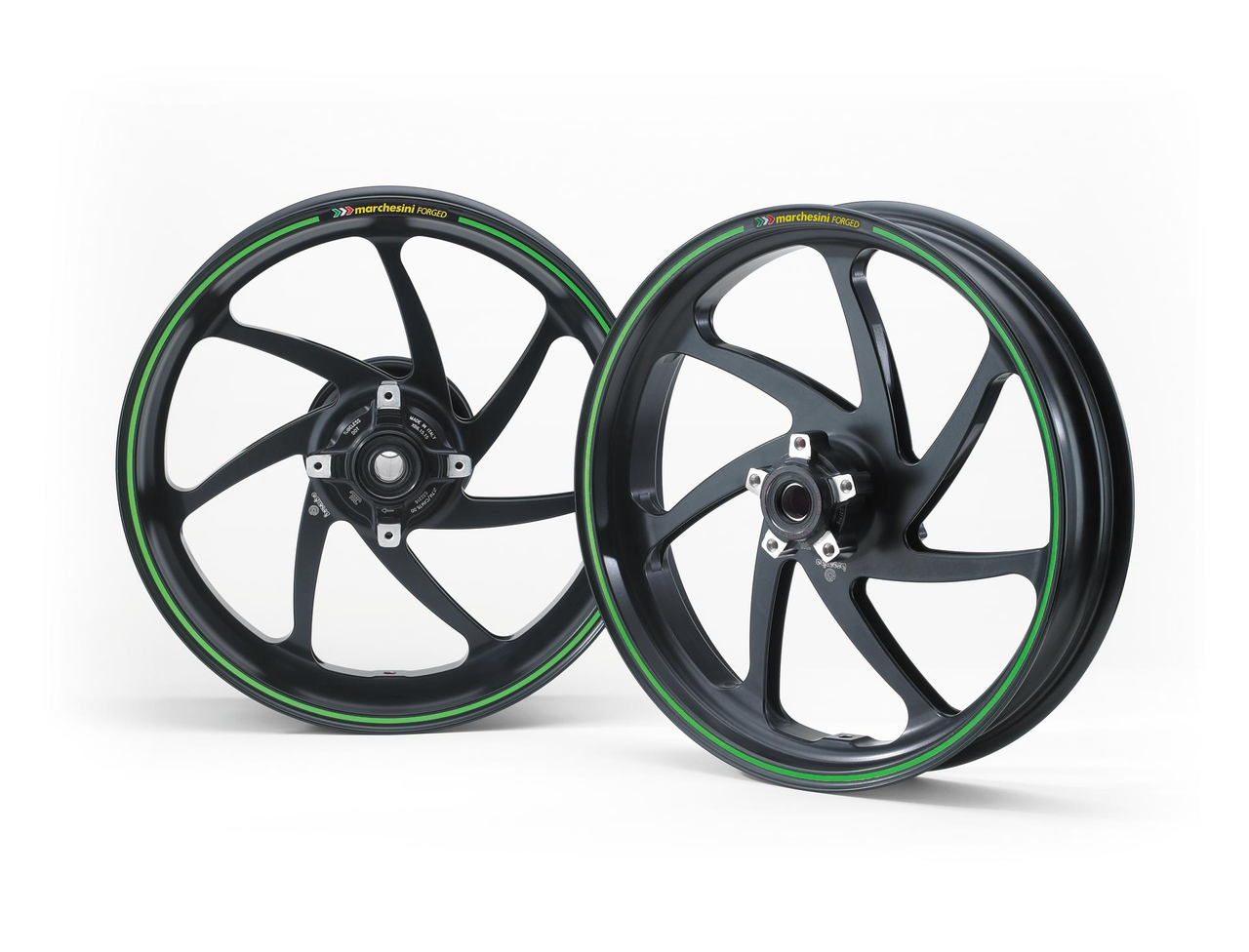 Kit de roue avant léger Marchesini. Comprend : 1 x roue avant en aluminium forgé Marchesini avec bande de jante, 2 x disque de frein avant, 1 x anneau capteur ABS avant, 10 x boulon pour capteur ABS/disque de frein avant, 1 x valve latérale en aluminium.